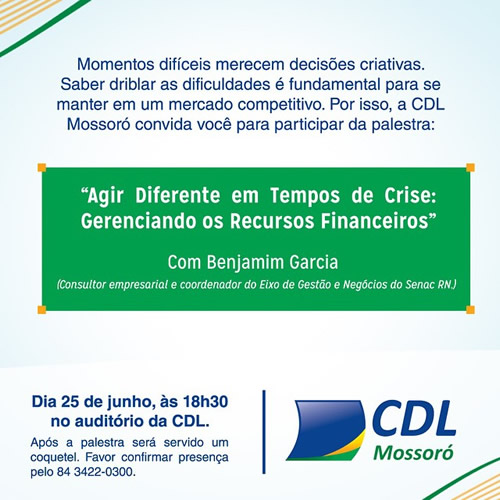 Para aproximar ainda mais os associados da entidade, a Câmara de Dirigentes Lojistas de Mossoró (CDL) dará início a um calendário de atividades. O primeiro evento acontece na quinta-feira, dia 25, com uma palestra com tema “Agir Diferente em Tempos de Crise: Gerenciando os Recursos Financeiros”. A palestra será realizada no auditório da CDL e será ministrada pelo consultor empresarial e palestrante, Benjamim Garcia, que também é Coordenador do Eixo de Gestão e Negócios do Senac RN. O presidente da CDL, Getúlio Vale, reforça o convite a todos os associados para estarem presentes nesse evento.