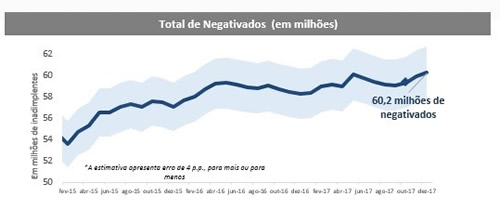 O ano de 2017 encerrou com um volume praticamente estável de brasileiros negativados estável, porém alto. Segundo dados do indicador do Serviço de Proteção ao Crédito (SPC Brasil) e da Confederação Nacional de Dirigentes Lojistas (CNDL) a estimativa é que o Brasil tenha fechado dezembro com aproximadamente 60,2 milhões de brasileiros com alguma conta em atraso e com o CPF restrito para contratar crédito ou fazer compras parceladas. O número representa 39,6% da população com idade entre 18 e 95 anos.