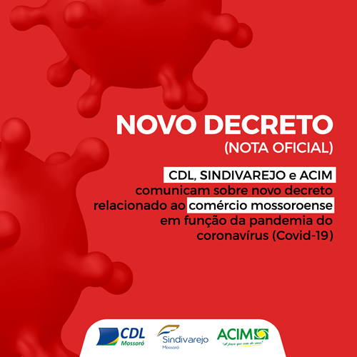 A Câmara de Dirigentes Lojistas de Mossoró (CDL), o Sindicato do Comércio Varejista de Mossoró (SINDIVAREJO) e Associação Comercial de Mossoró (ACIM) comunicam a publicação de novo Decreto, n. 5.670, pela Prefeitura de Mossoró onde prorroga por mais 15 dias o fechamento do comércio não essencial, com as exceções já tratadas em decretos anteriores.