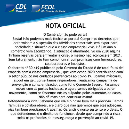 Nota Oficial CDL Mossoró sobre decreto do RN, n. 30.419