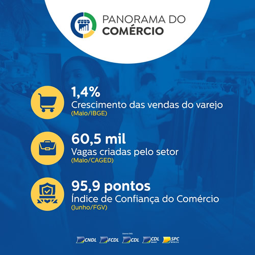 Os dados de vendas referentes a junho ainda serão apurados, mas o Indicador de Confiança do Comércio, medido pela Fundação Getulio Vargas, mostrou que, no último mês, houve um avanço na avaliação da situação atual por parte dos comerciantes. Esse indicador pode ser visto como um antecedente do desempenho do setor.