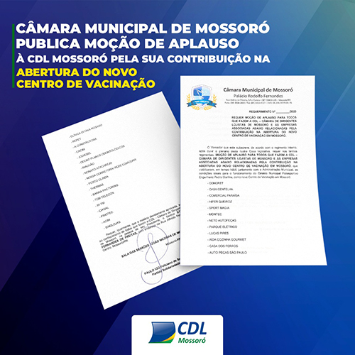 A moção de aplausos publicada no dia 3/08, vista como reconhecimento ao esforço da classe lojista em ajudar o município à acelerar a vacinação dos mossoroenses, é recebida com gratidão pela CDL Mossoró e toda classe produtiva.